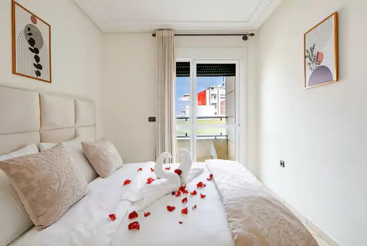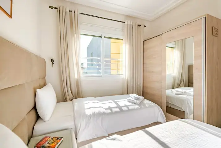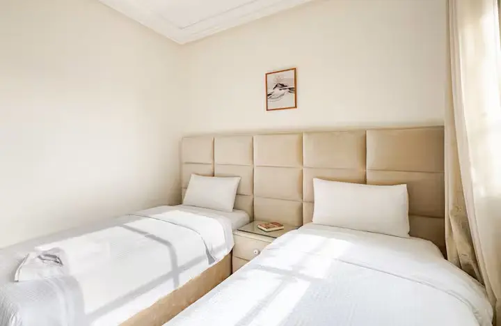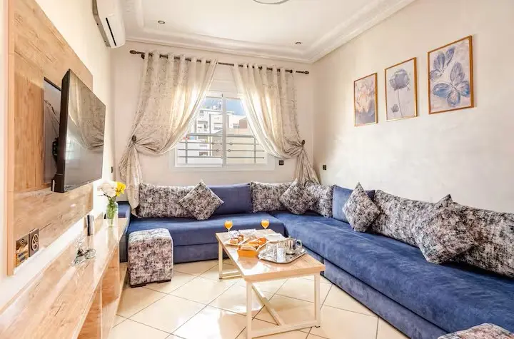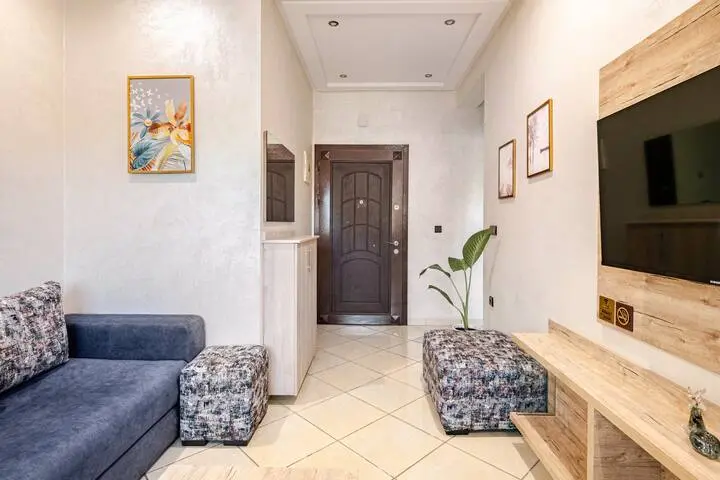 Appartement de deux chambres, idéalement situé à proximité du centre commercial Marjane. Spacieux et lumineux, il dispose de chambres confortables, d'un salon chaleureux avec canapé et télévision, ainsi que d'une cuisine moderne entièrement équipée.
